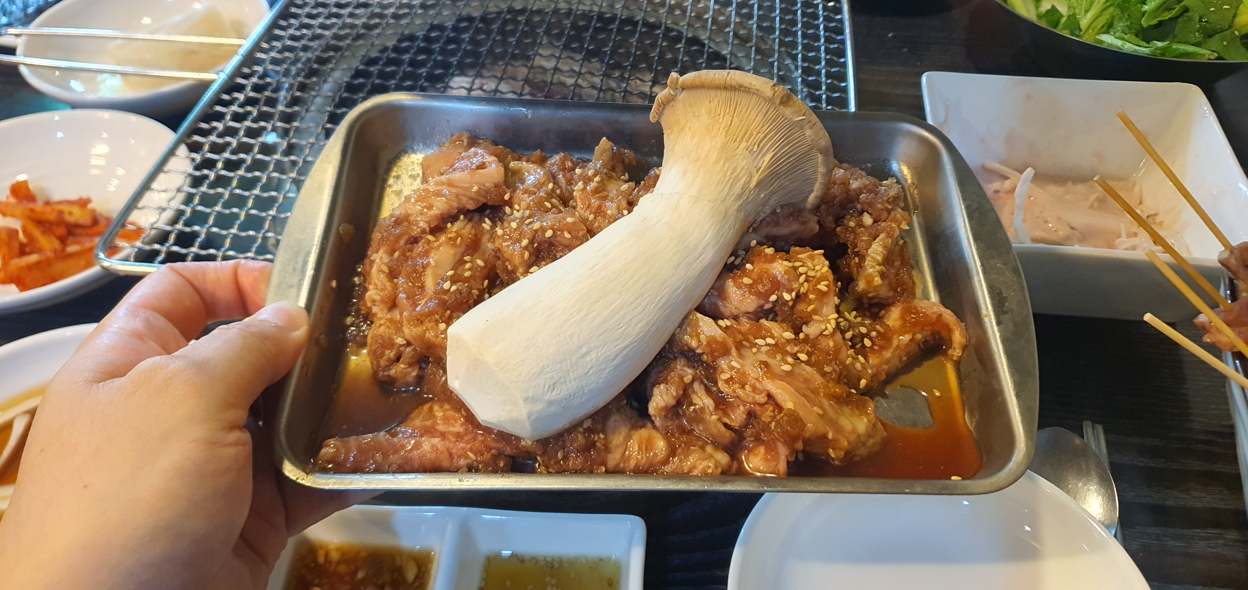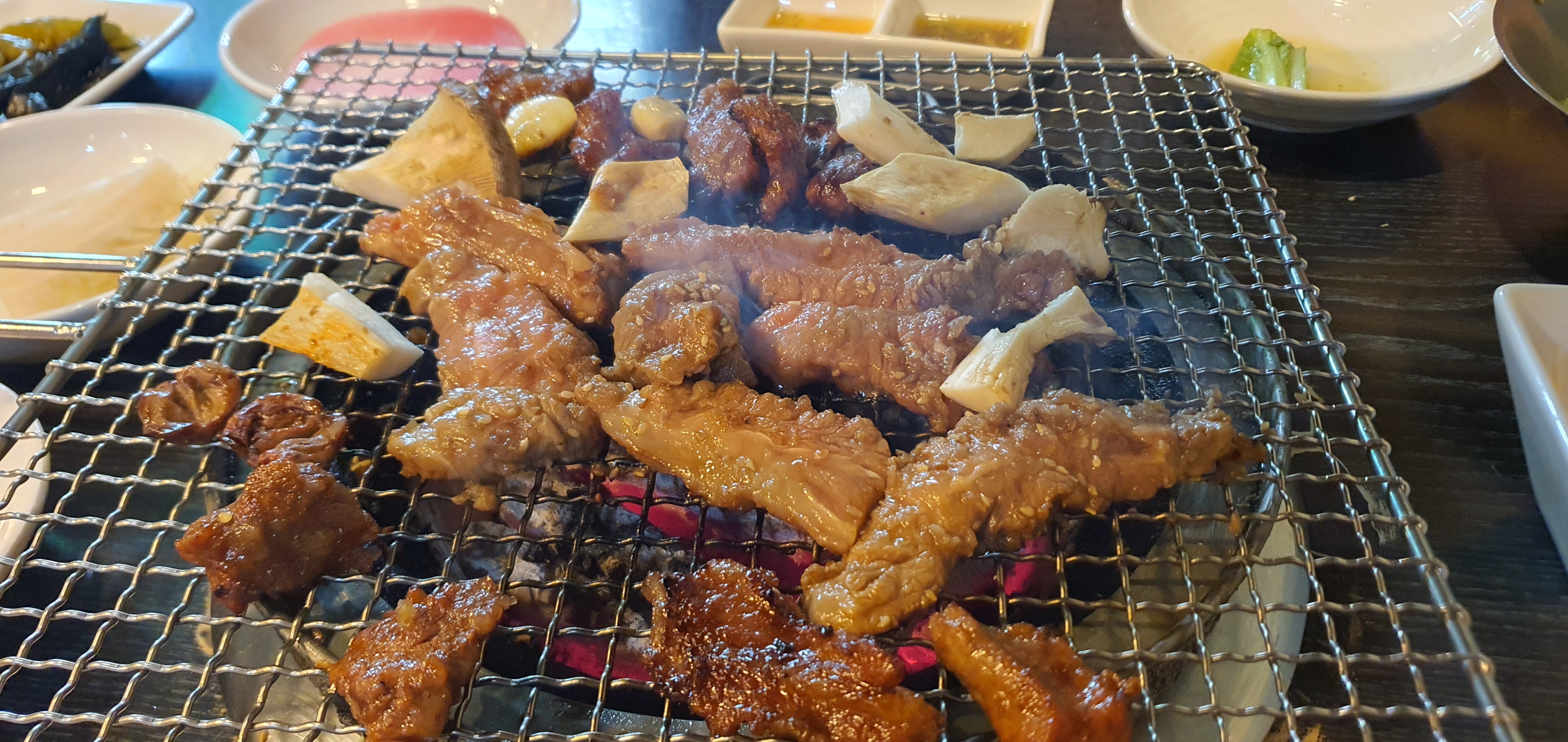 100% 참숯을 사용하여 화력이 강해 고기가 빨리 익는 점이 정말 좋았습니다. 양념갈비를 굽는 동안 군침이 절로 돌았고, 버섯도 잘게 썰어 함께 먹어보니 정말 맛있었습니다.