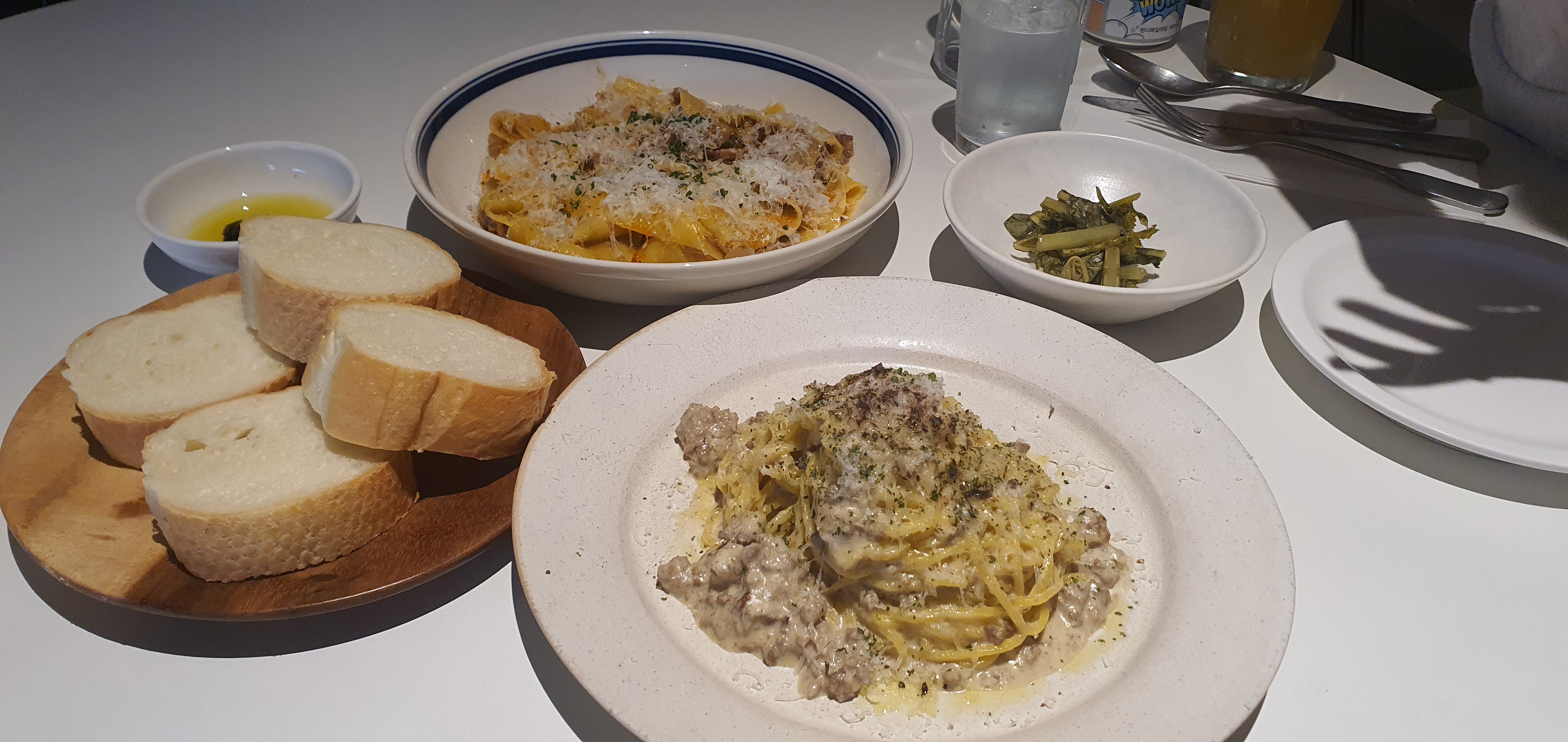 저희는 화이트 라구 파스타와 소갈비살 라구 파스타, 그리고 바게트를 주문했습니다. 잉글룸에 가기 전, 여러 후기를 찾아보니 파스타가 특히 맛있다는 이야기가 많더라고요. 그래서 기대가 컸습니다! 바게트는 리필이 가능하다고 하니, 배가 고프신 분들은 참고하시면 좋을 것 같아요. 저도 리필하고 싶었지만, 다이어트를 생각하며 꾹 참았습니다...ㅠㅠ