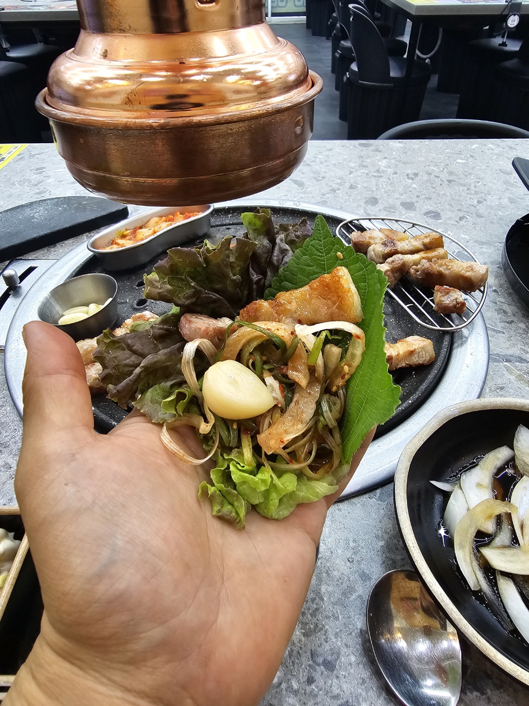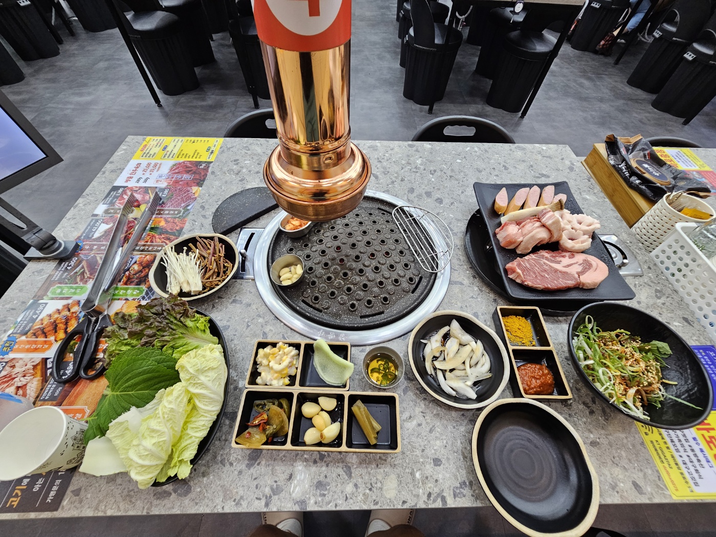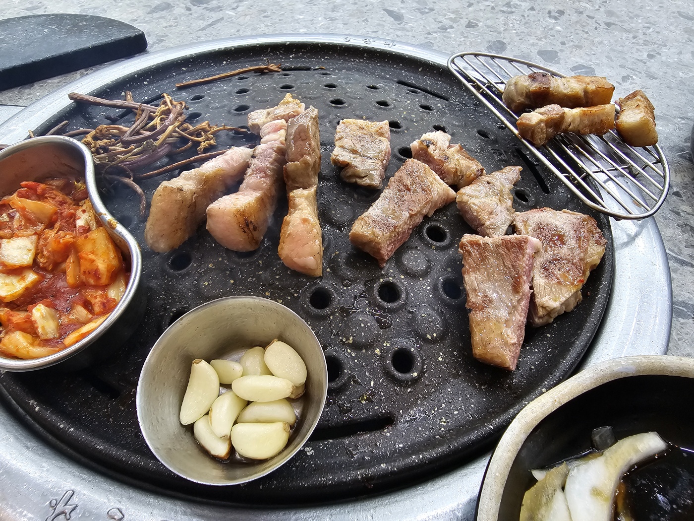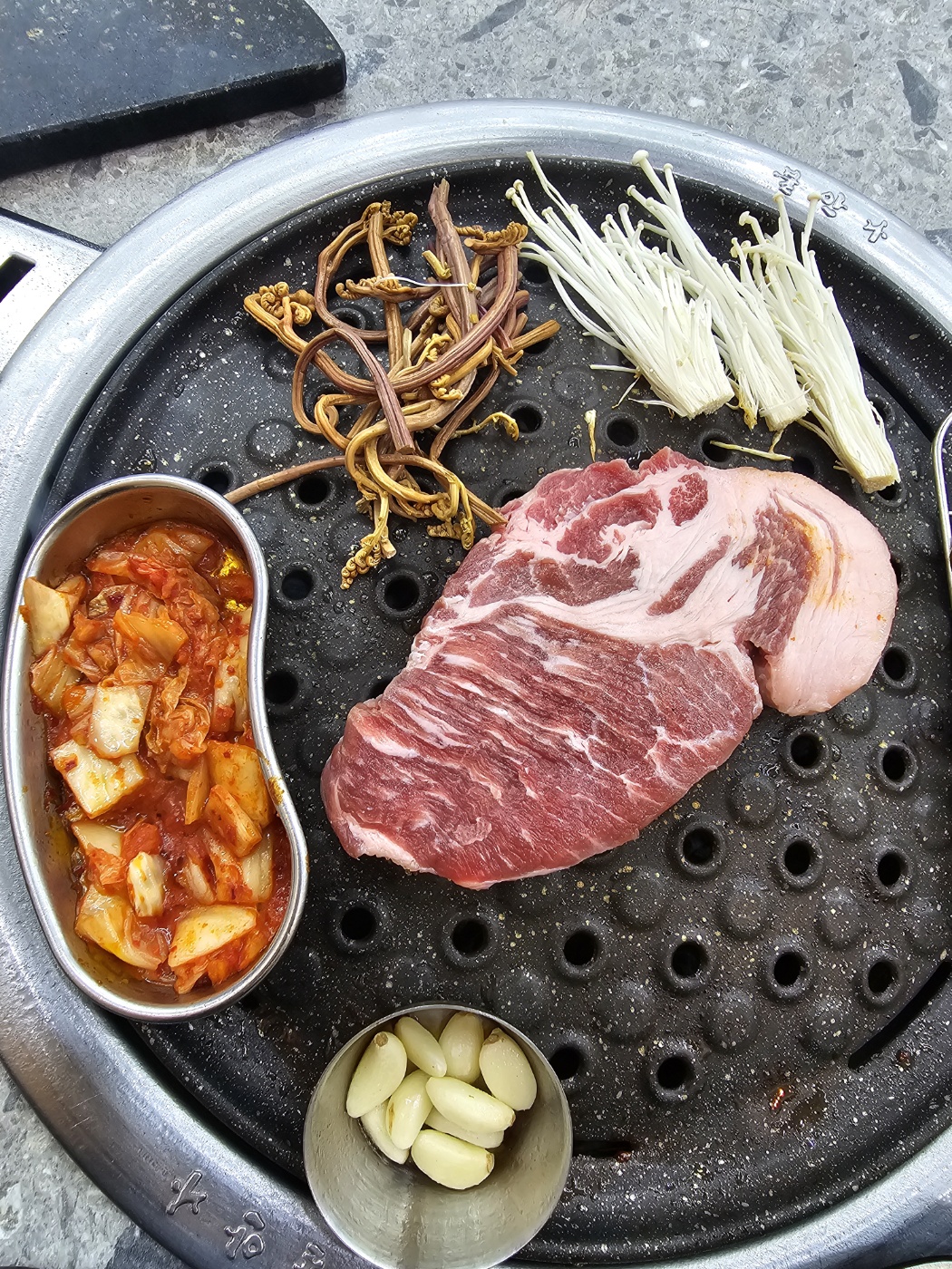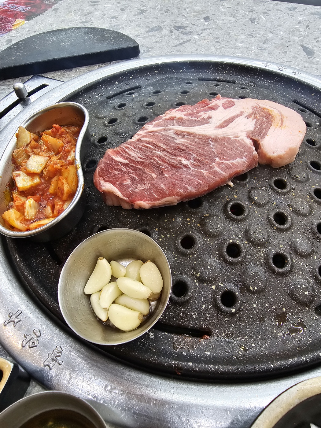 고기와 함께 제공된 김치와 마늘도 분리해서 구울 수 있도록 되어 있었는데, 볶은 김치와 고기를 함께 먹으니 느끼함이 덜하고 정말 맛있었어요. 고기와 함께하는 다양한 반찬들이 조화를 이루어, 한 끼 식사가 더욱 풍성해졌습니다.