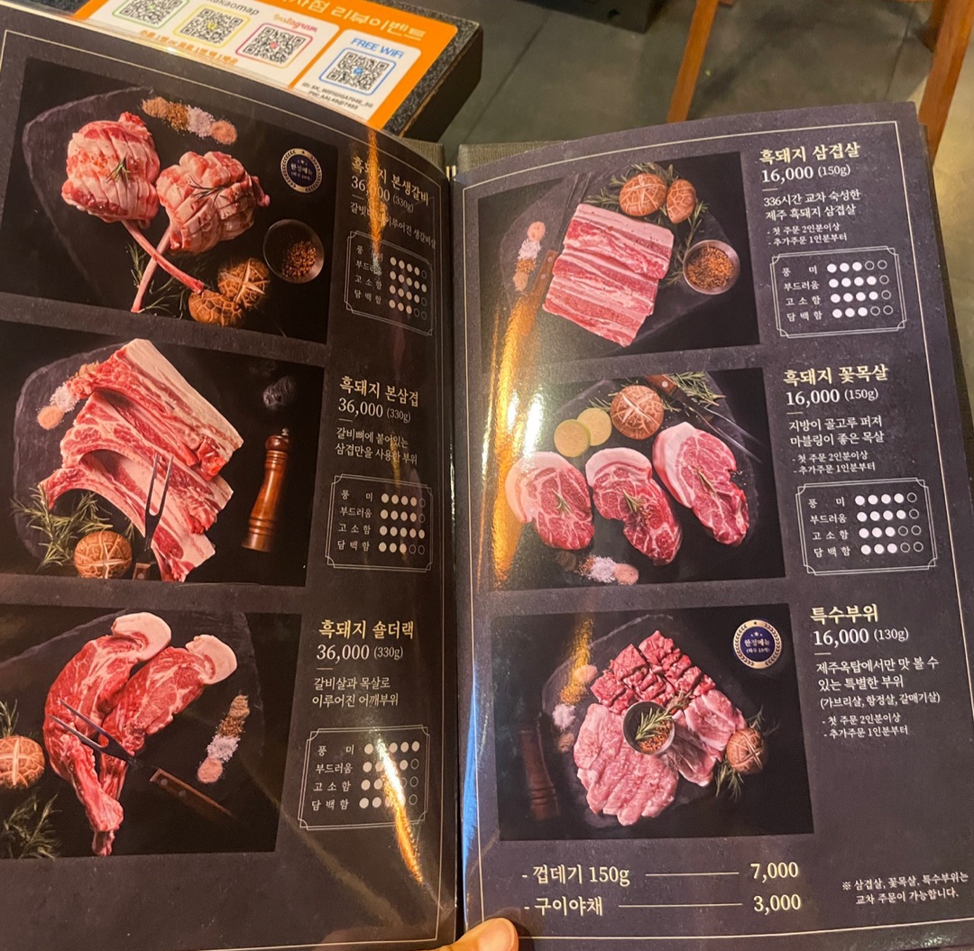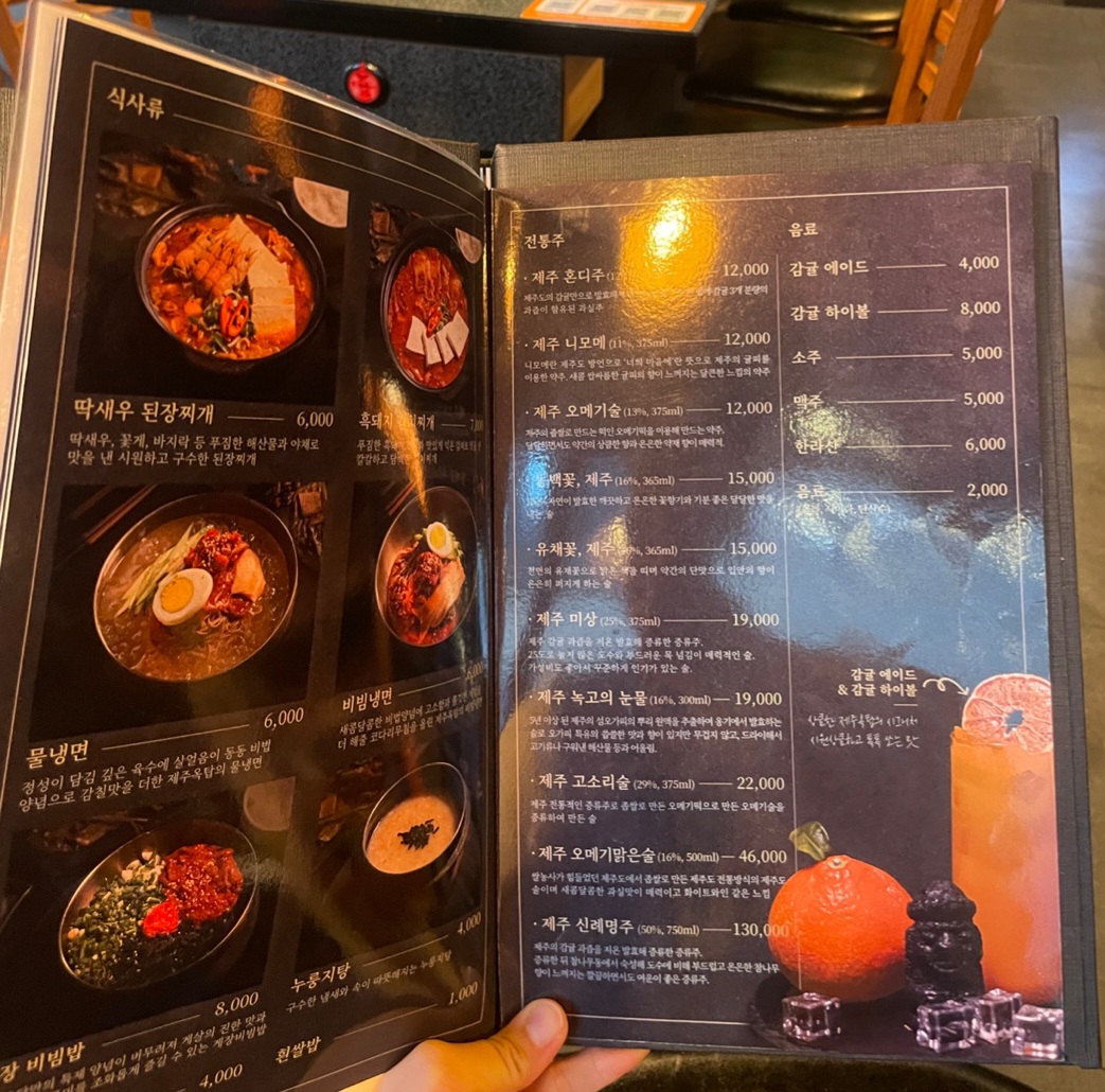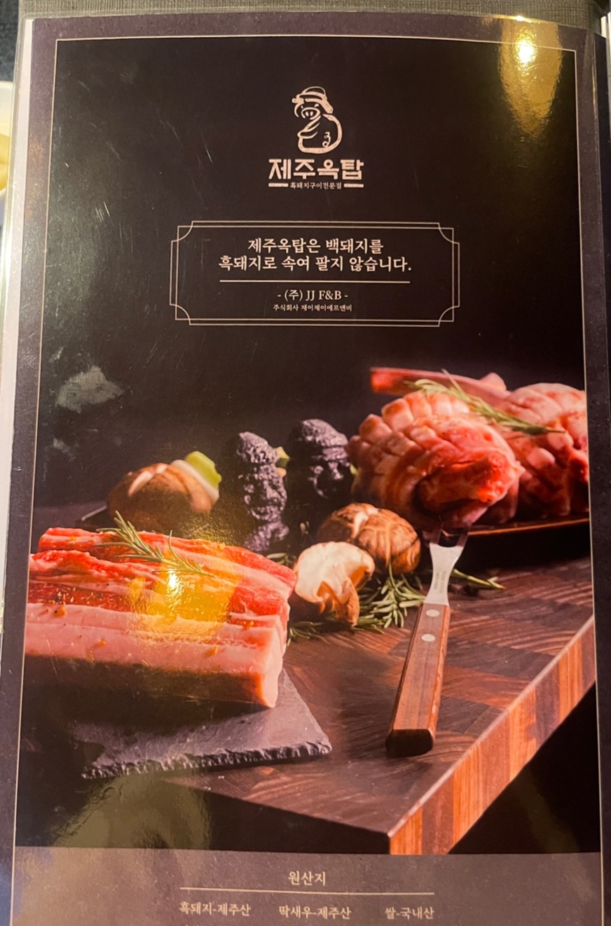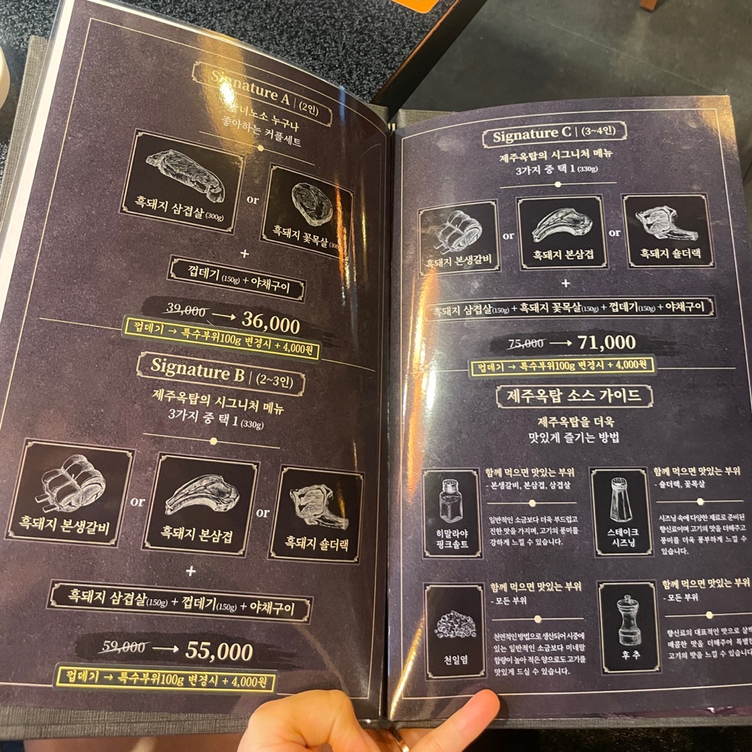 제주옥탑의 점심특선은 가성비가 뛰어나서 다음에는 점심에 방문해보려 해요. 메뉴판도 잘 정리되어 있어 선택하기 쉬웠습니다. 특히 제주옥탑만의 시그니처 메뉴가 다양하게 준비되어 있어 인원에 맞춰 주문할 수 있었습니다.