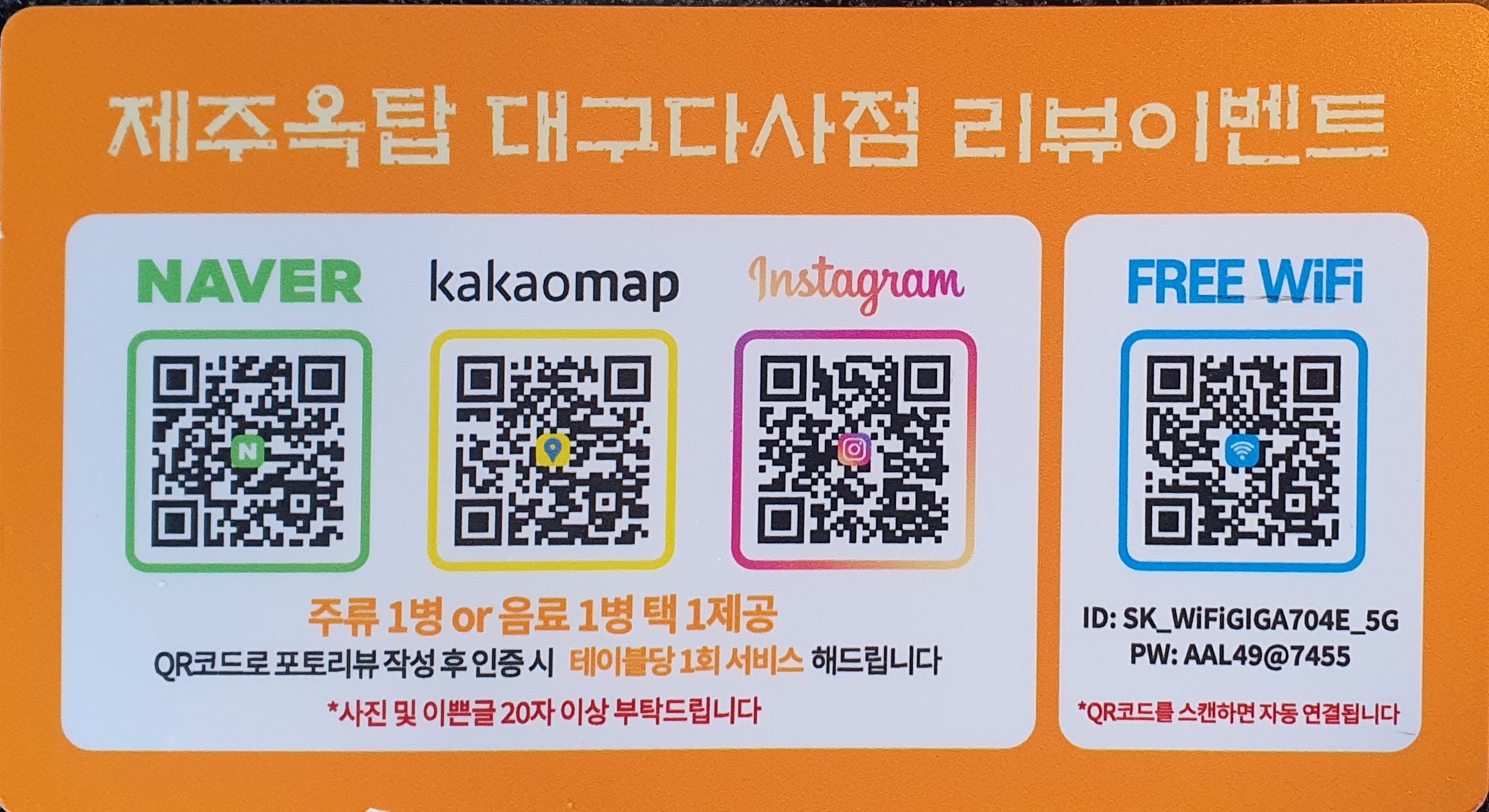 리뷰 이벤트도 진행 중이니, 참여하셔서 주류나 음료를 받아가세요! 와이파이도 QR코드로 쉽게 연결할 수 있어 편리했습니다.