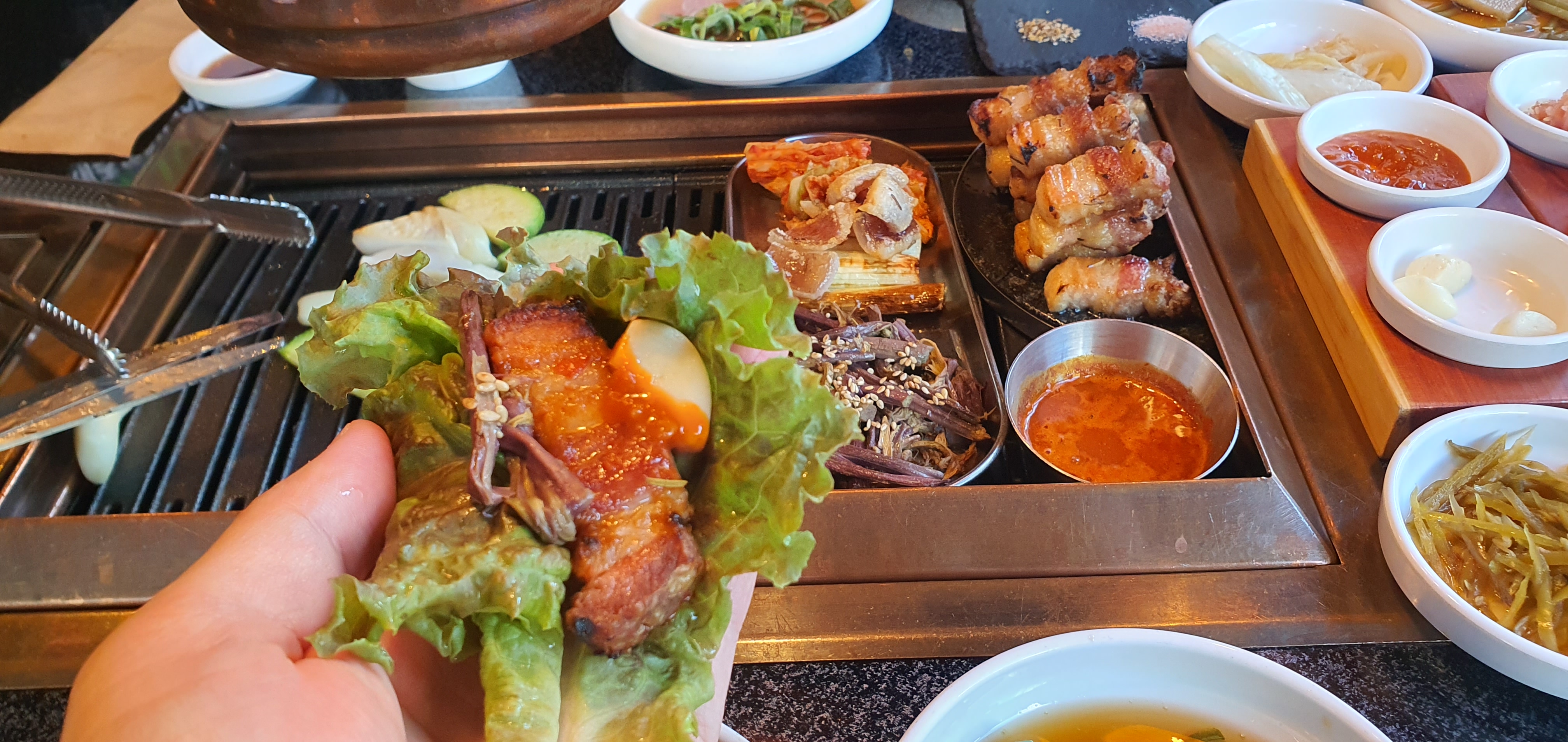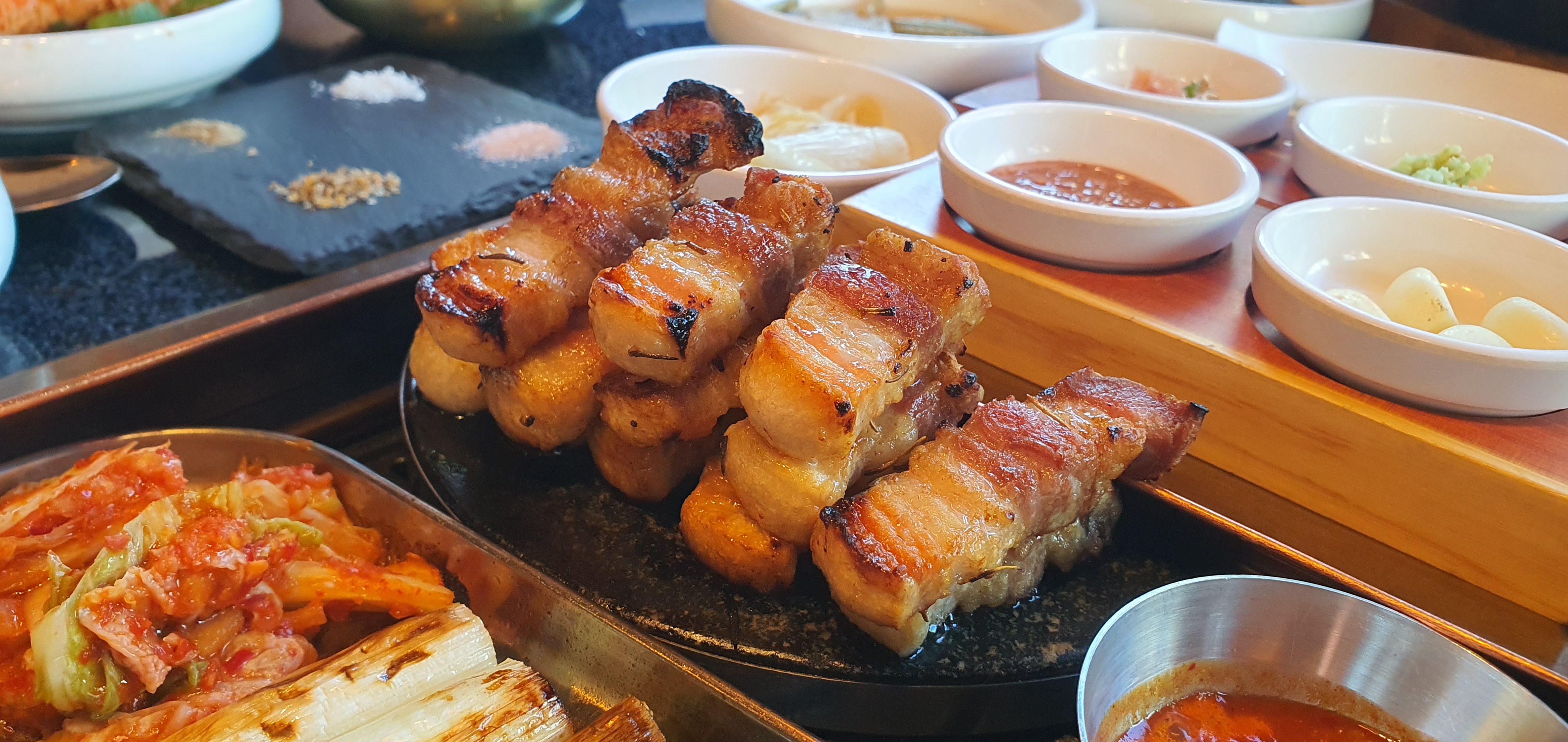 고기가 식지 않도록 돌판에 올려주셔서 따뜻하게 즐길 수 있었어요.