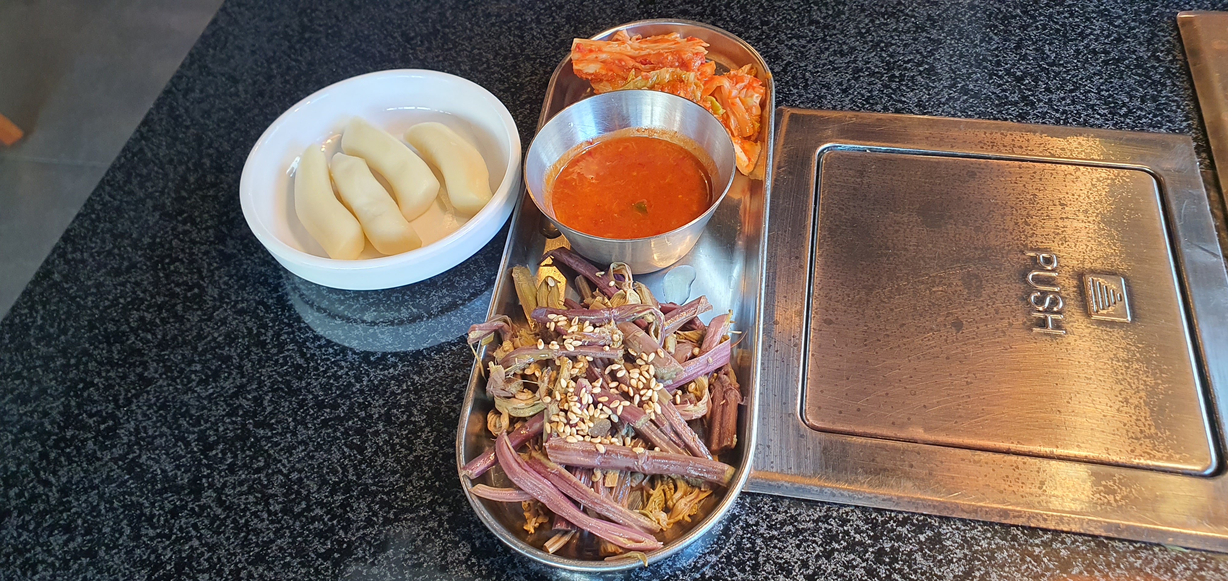 고사리, 김치, 떡, 멸젓 등 다양한 반찬이 함께 제공되어 맛있게 즐길 수 있었습니다.