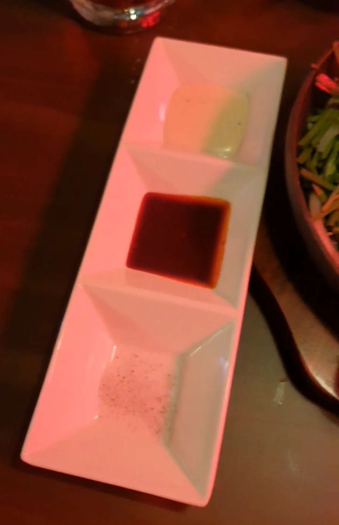 상차림이 정말 예뻤어요! 기본찬으로는 치킨무와 소금, 설탕에 버무린 땅콩이 제공되었습니다.
