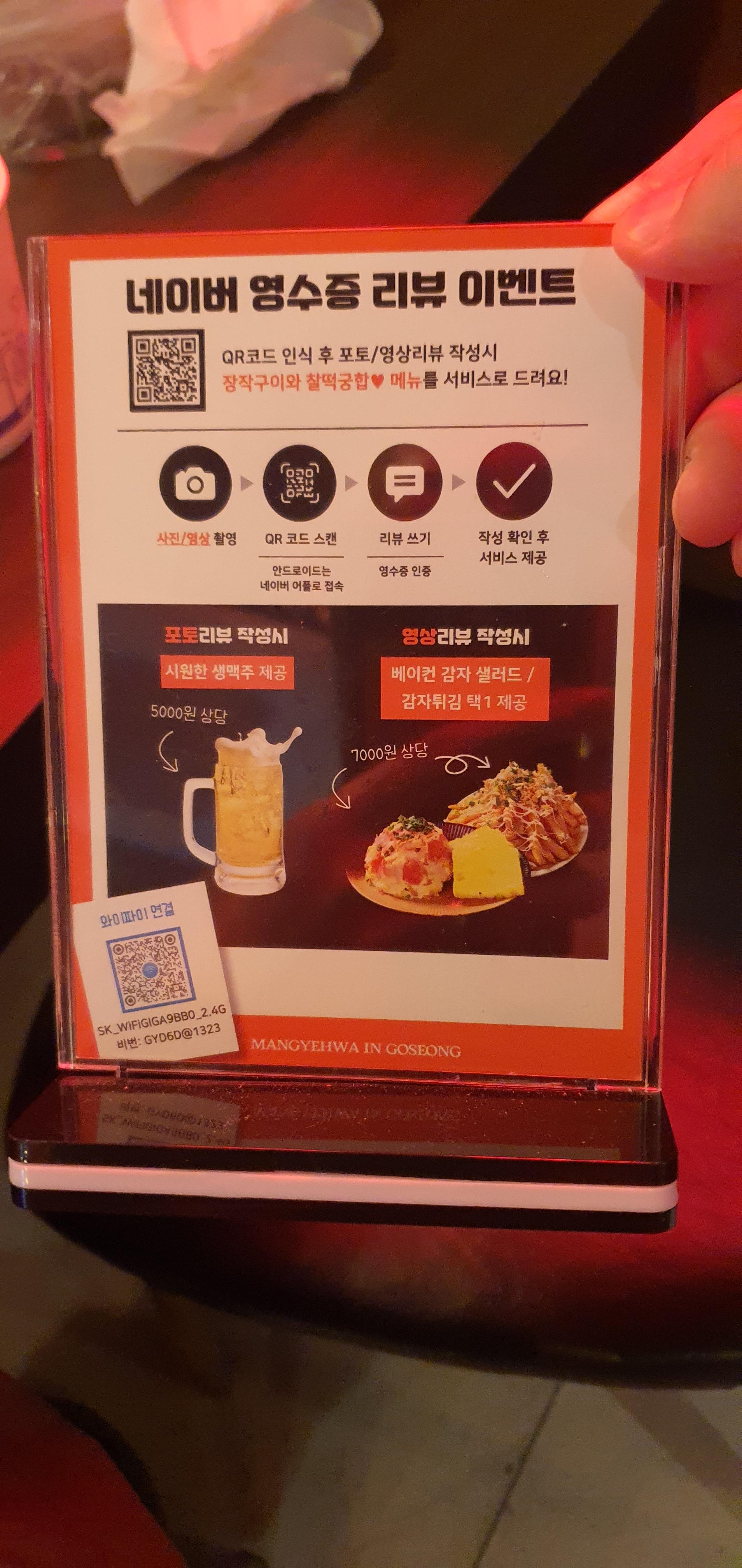 만계화에서는 리뷰 이벤트도 진행 중이었는데, 포토리뷰를 남기면 5,000원 상당의 생맥주를 제공하고, 영상리뷰를 남기면 베이컨 감자샐러드나 감자튀김을 선택할 수 있었습니다. 또한, 대구FC 경기 티켓을 소지한 분들에게는 감자튀김, 생맥주 1잔, 소주 1병을 서비스로 제공하는 이벤트도 진행하고 있어, 축구 관람 후에 방문하기 좋은 곳이었습니다.