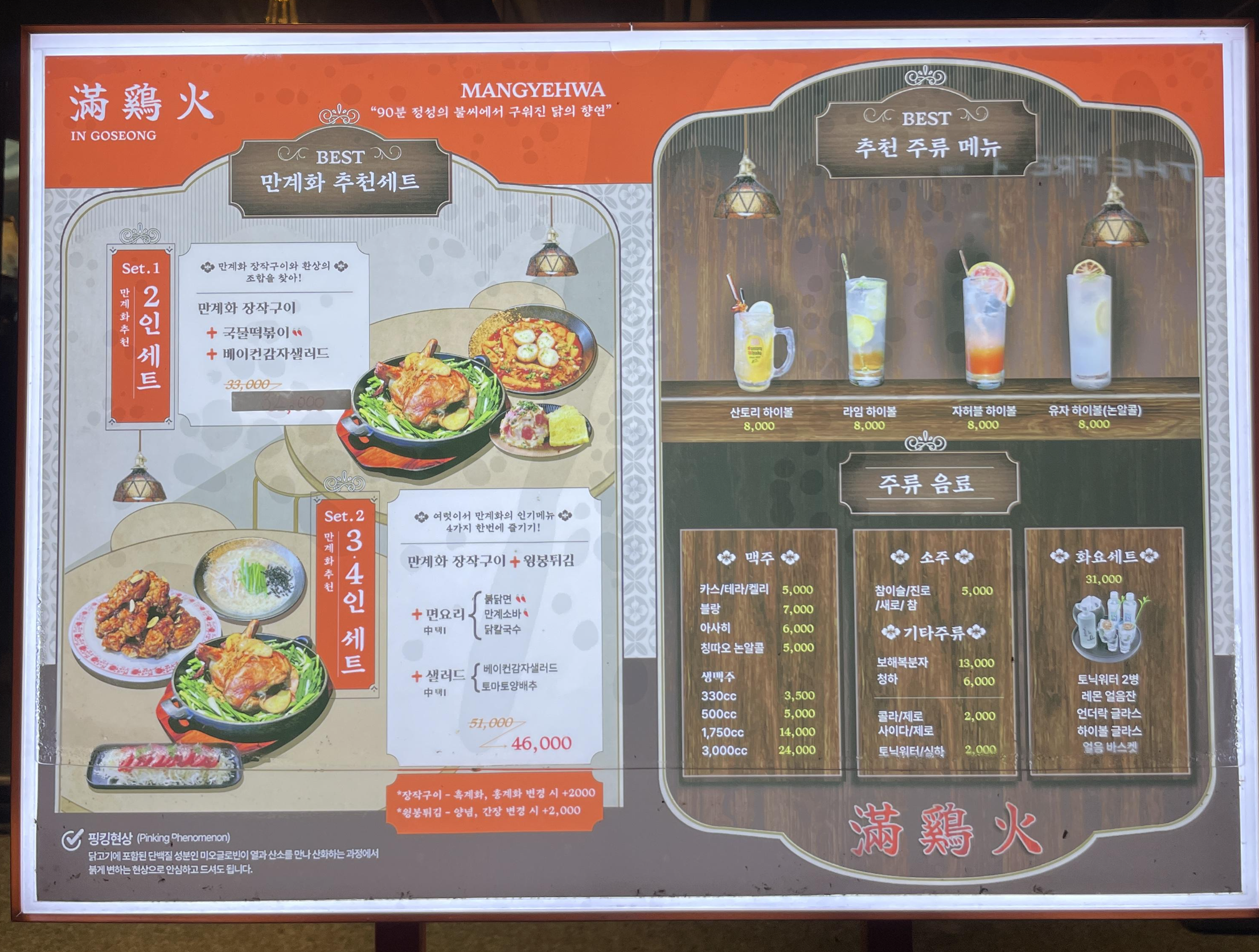 메뉴는 장작구이, 닭발, 튀김, 스페셜 메뉴, 사이드 메뉴 등 다양하게 준비되어 있었고, 주류도 맥주, 소주, 화요세트, 하이볼 등 선택의 폭이 넓었습니다. 골라 먹는 재미가 있어 더욱 즐거웠습니다.