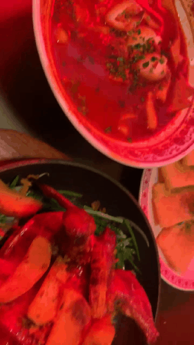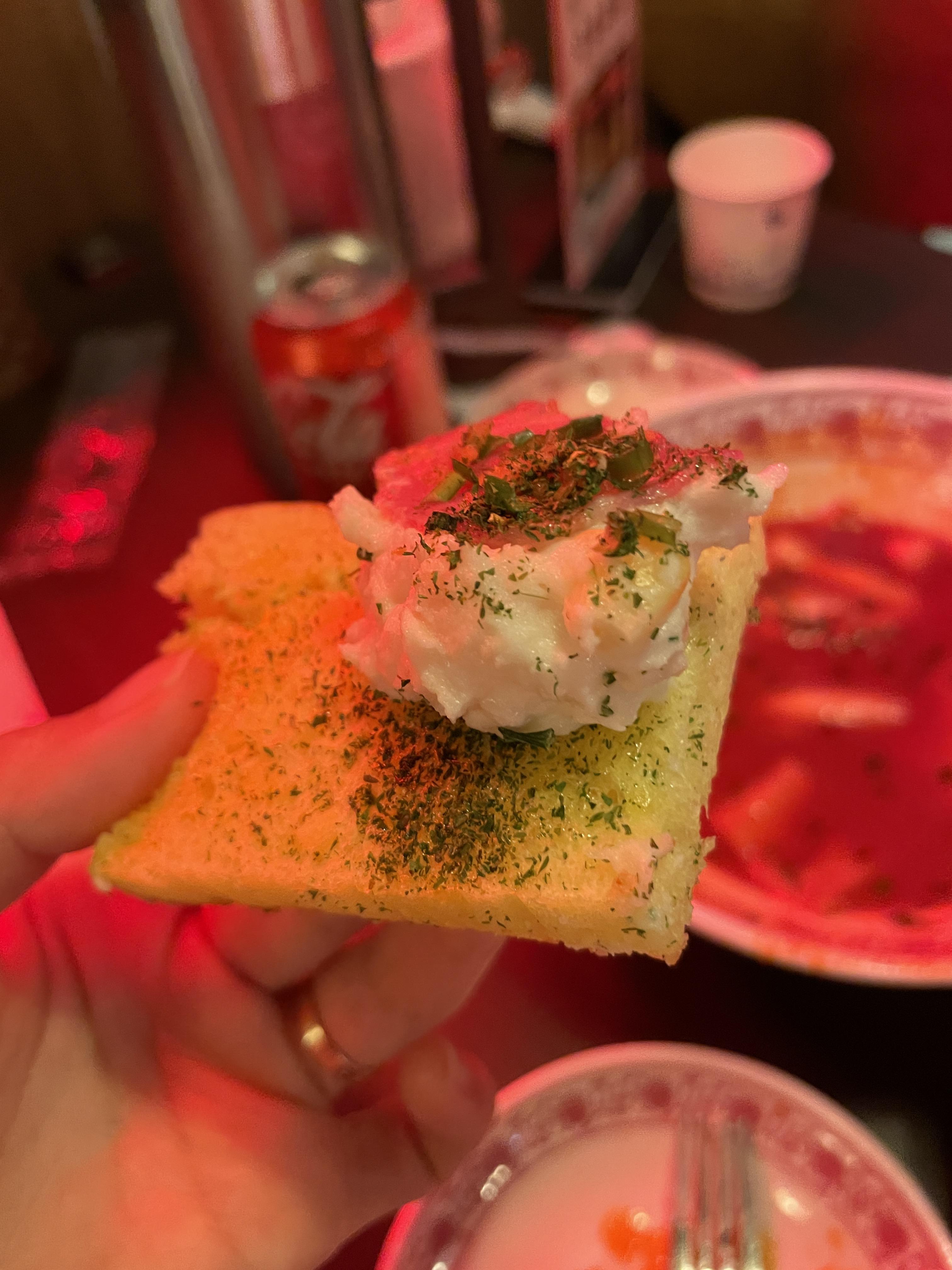 국물떡볶이에는 치즈스틱이 들어가 있어, 떡볶이 국물과 환상적인 조화를 이루었습니다. 그리고 베이컨 감자샐러드는 정말 맛있었어요! 빵에 샐러드를 얹어 먹으니 그 조합이 너무 좋았습니다.