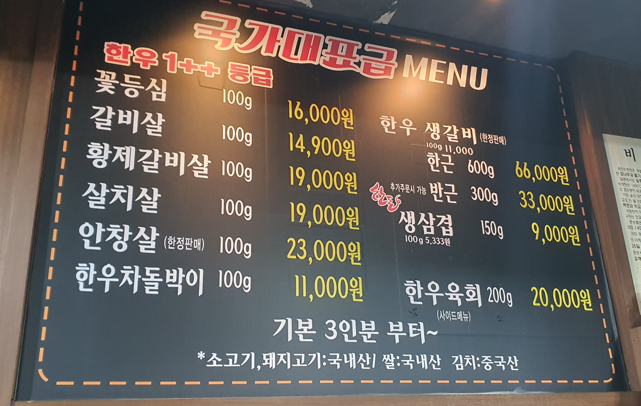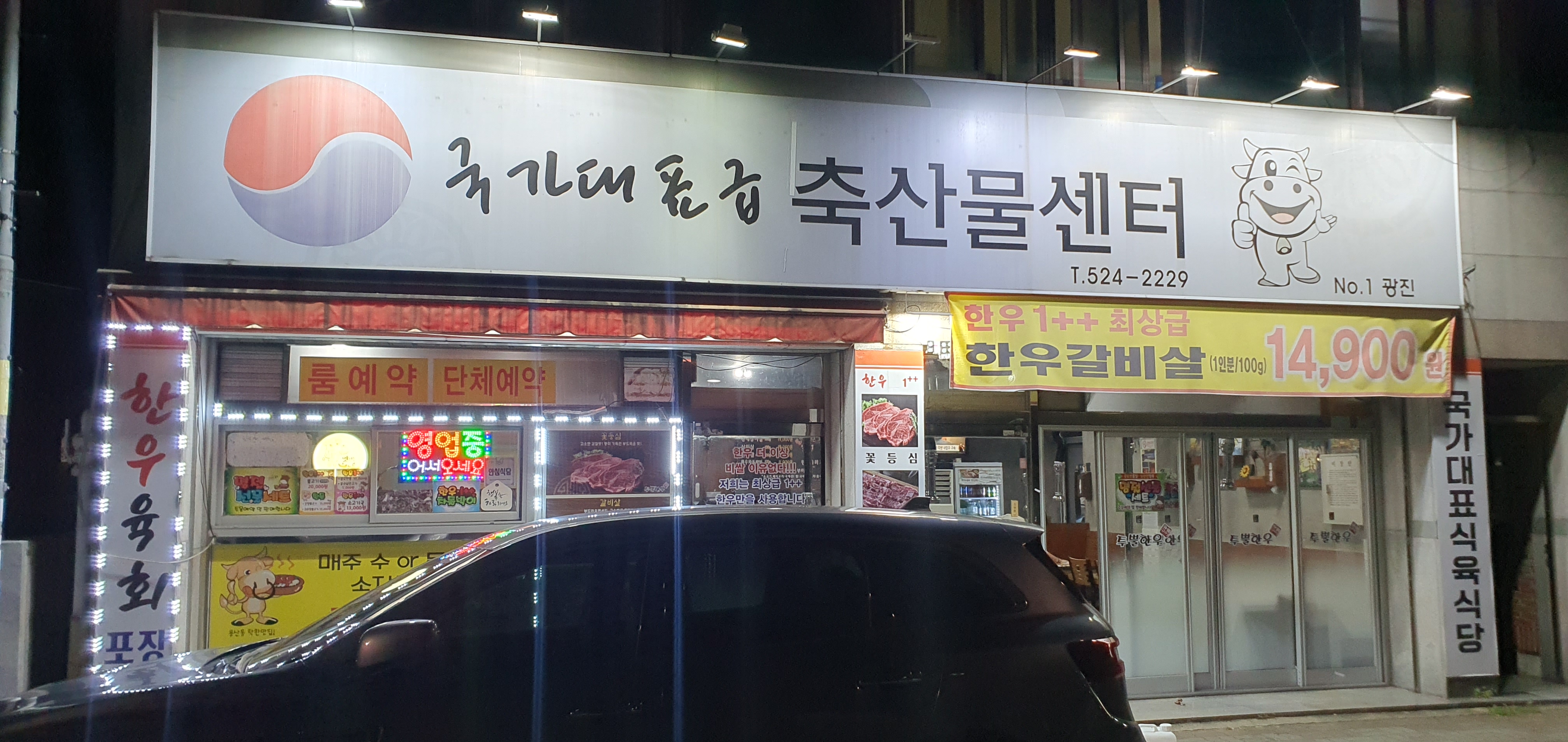 가게에 도착하자마자 눈에 띄는 것은 바로 우리나라 국기 마크가 반겨주는 외관이었습니다. 이곳의 매력 중 하나는 최상급 한우 갈비살이 14,900원이라는 점인데요, 가격이 정말 매력적이었습니다.