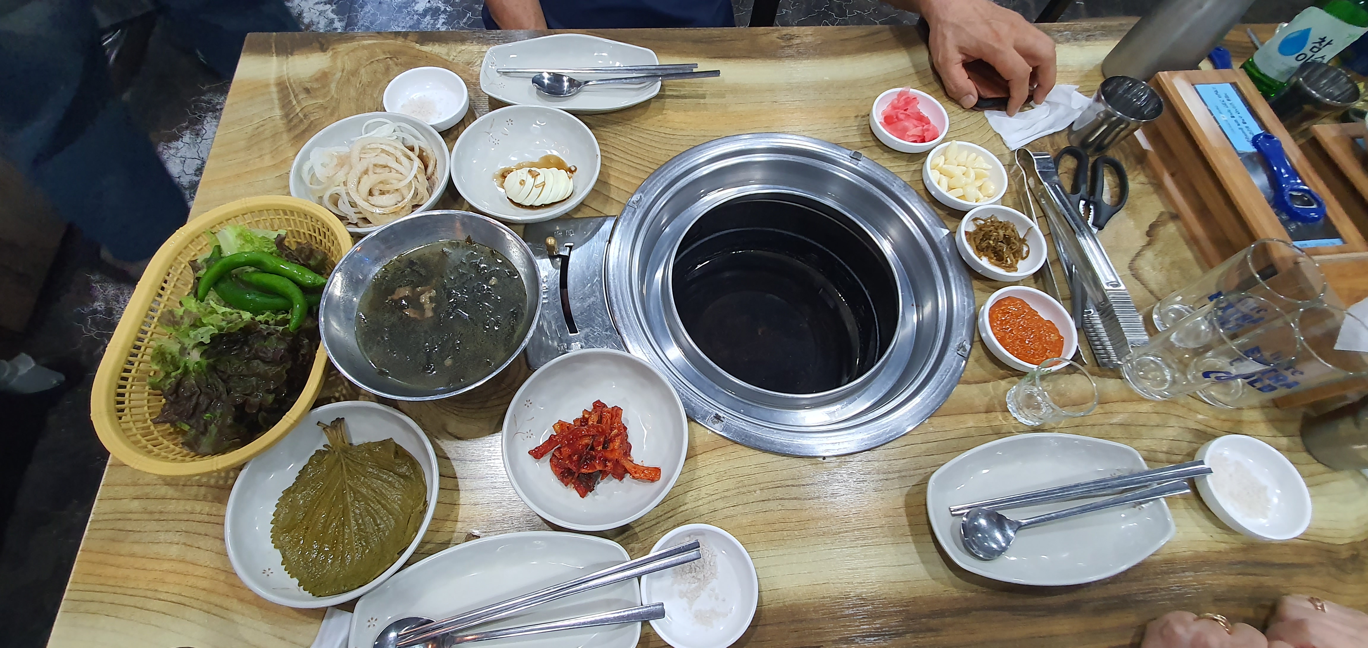 상차림은 양파 저림, 계란, 미역국, 깻잎, 오그락지, 쌈, 소금장, 양념장 등으로 푸짐하게 나왔습니다.