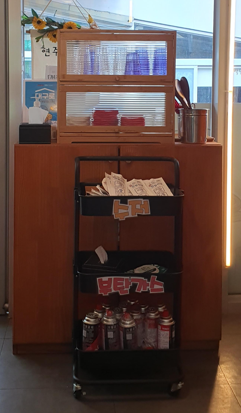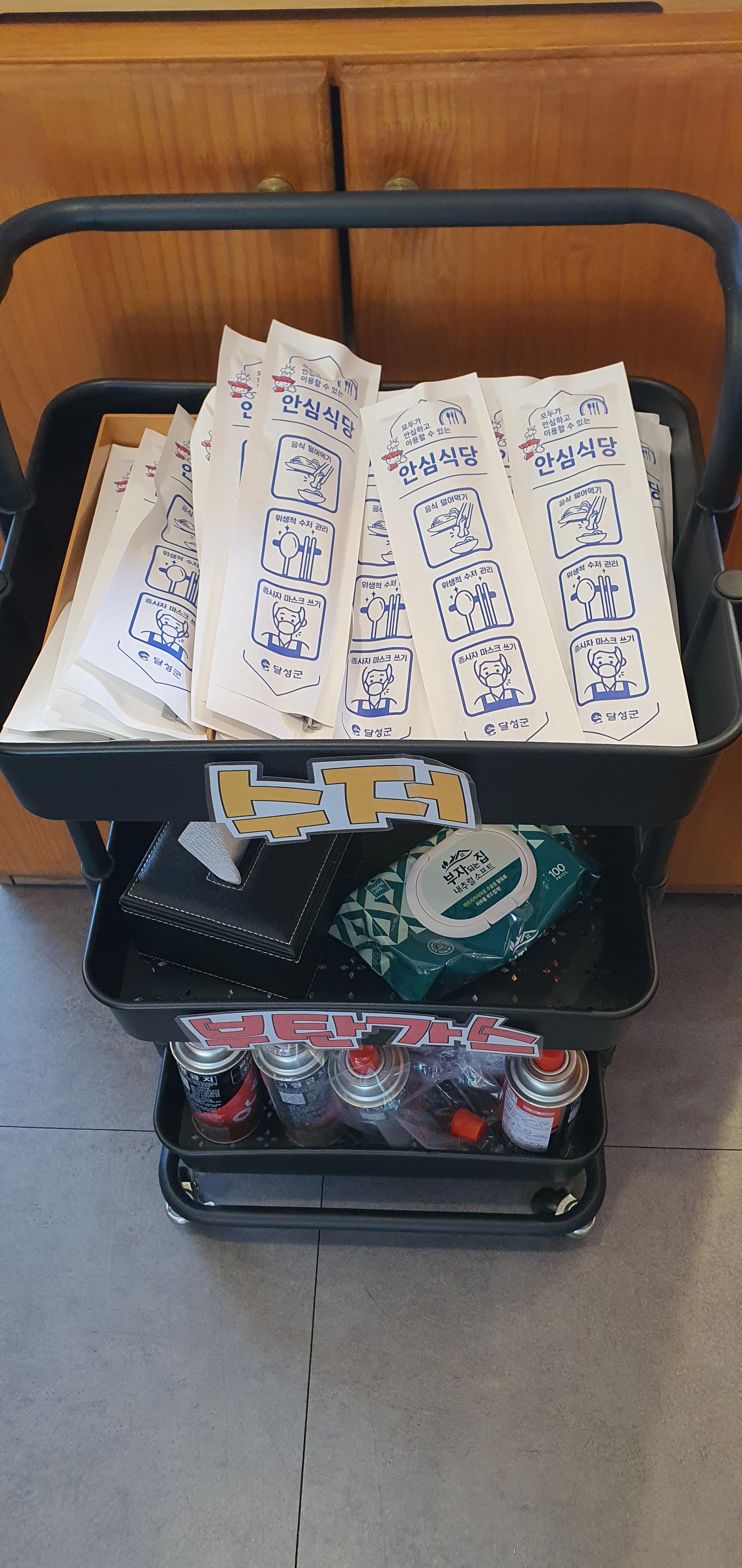 셀프코너가 마련되어 있어 수저, 티슈, 물티슈, 부탄가스 등을 자유롭게 이용할 수 있었어요.