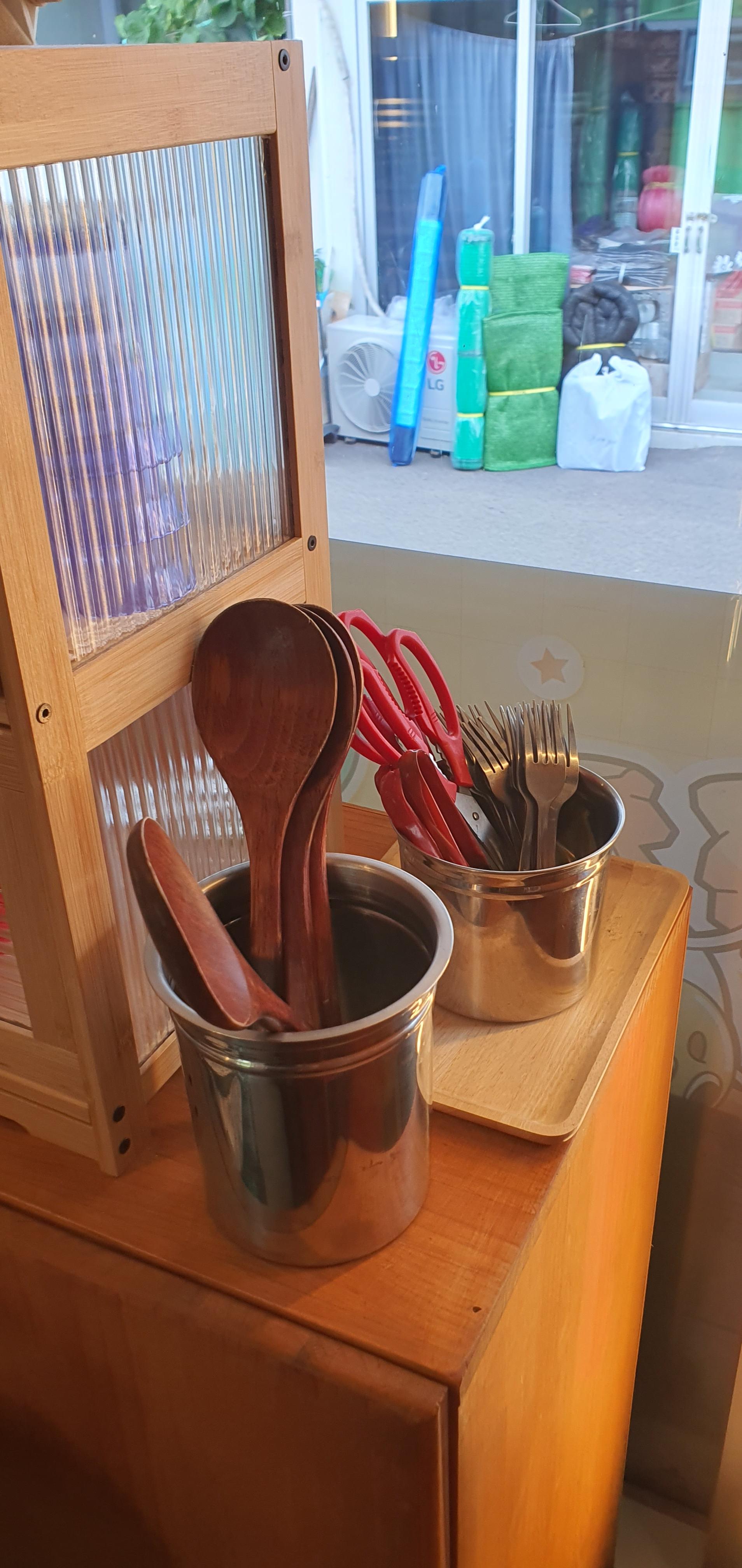 셀프코너에는 앞접시와 컵도 준비되어 있어 물도 쉽게 이용할 수 있었답니다. 또한, 즉석떡볶이를 비벼줄 나무주걱과 포크, 집게, 가위도 갖춰져 있어 편리했습니다.