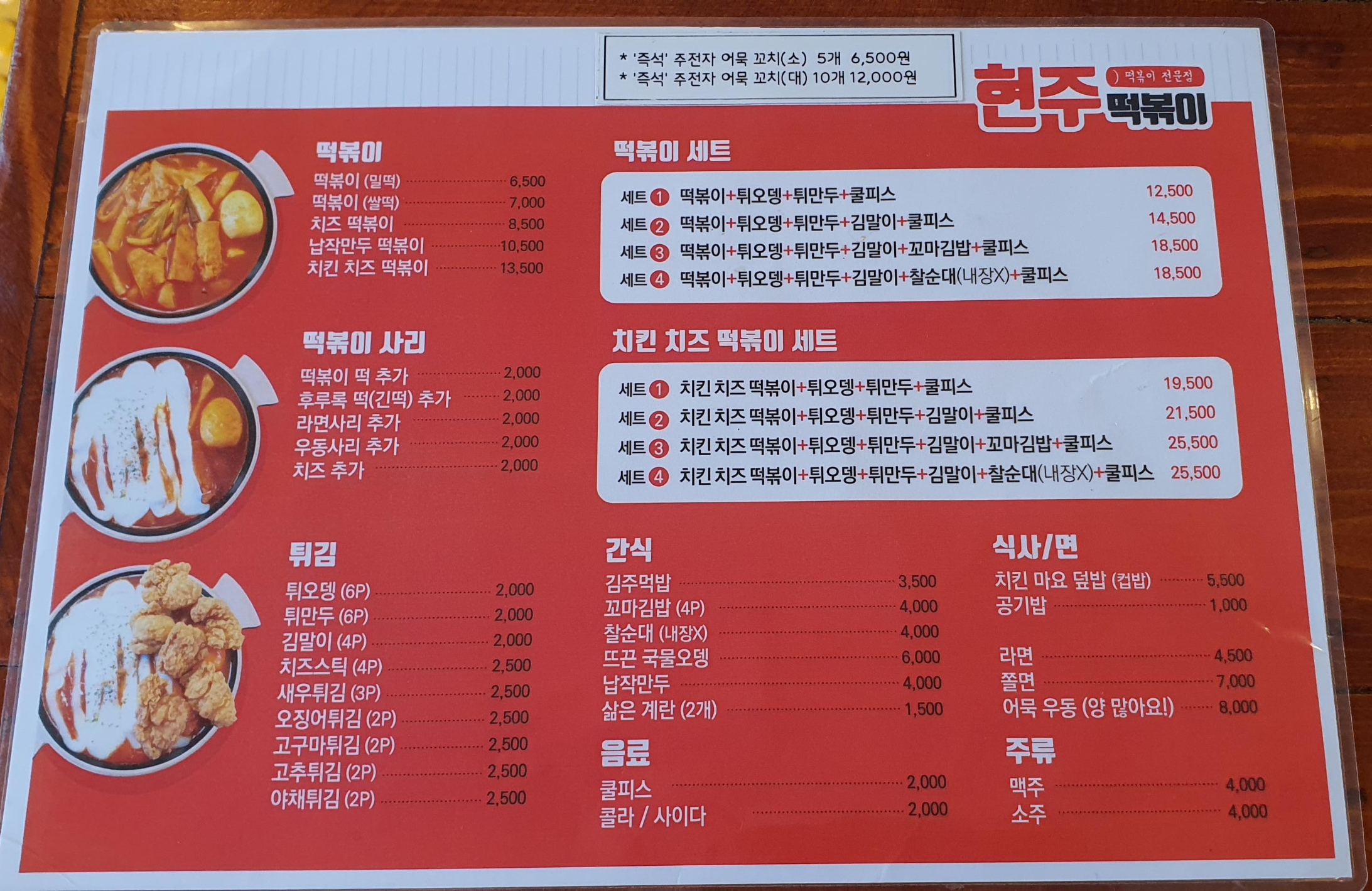 현주떡볶이의 메뉴는 크게 떡볶이, 튀김, 사이드 음식으로 나뉘어 있습니다. 떡볶이 세트와 치킨치즈 떡볶이 세트도 있어 취향에 맞게 선택할 수 있는 점이 좋았습니다. 주류도 판매하고 있어 안주로 즐기기에도 안성맞춤입니다. 특히, 어릴 적 추억을 떠올리게 하는 피카츄 꼬치도 메뉴에 있어 반가웠어요.