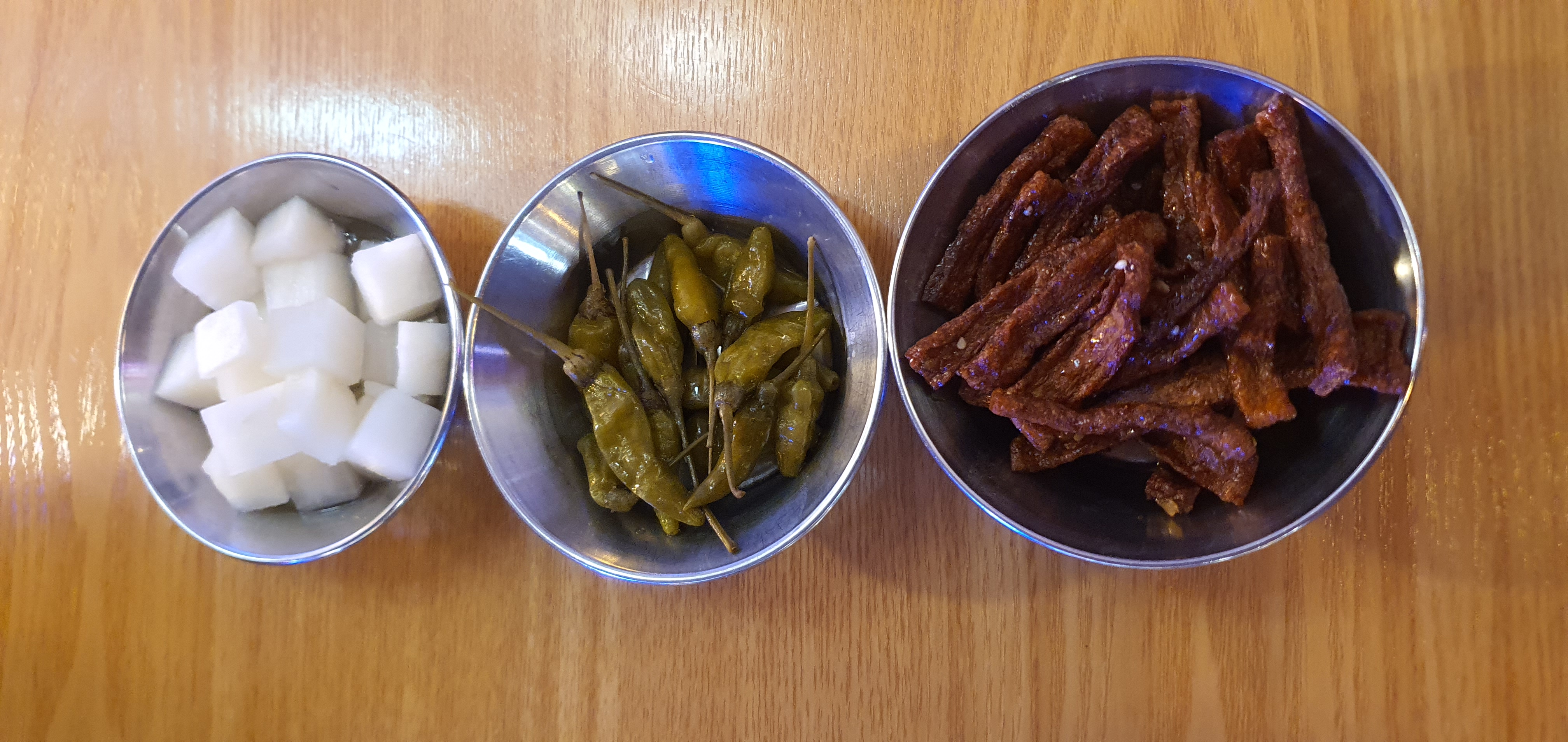 기본찬으로 나온 치킨무, 고추짱아찌, 어묵튀김이 심플하면서도 맛있었어요. 특히 어묵튀김은 요리 기다리면서 자꾸 손이 가더라고요.